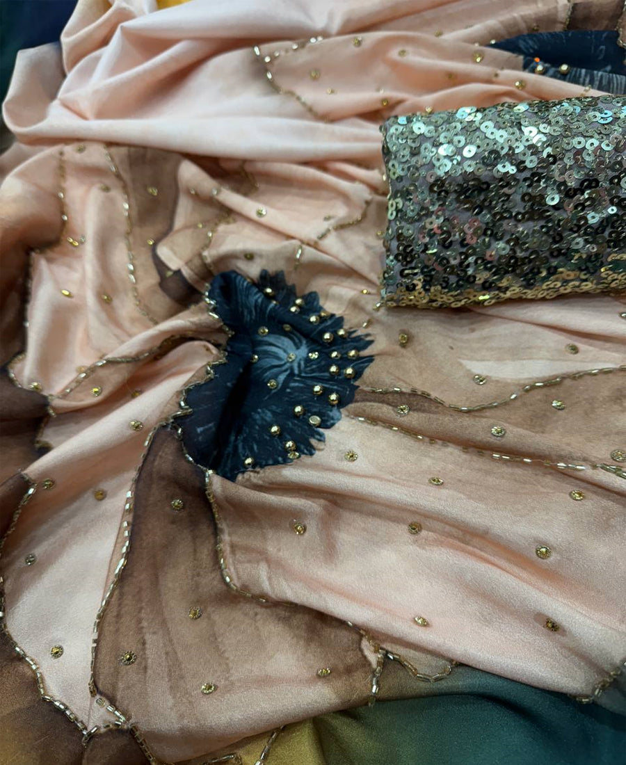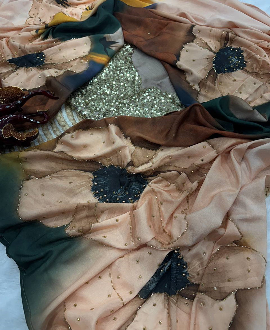 Satin Crepe Floral Print With Katdana And Pearls Handwork Saree